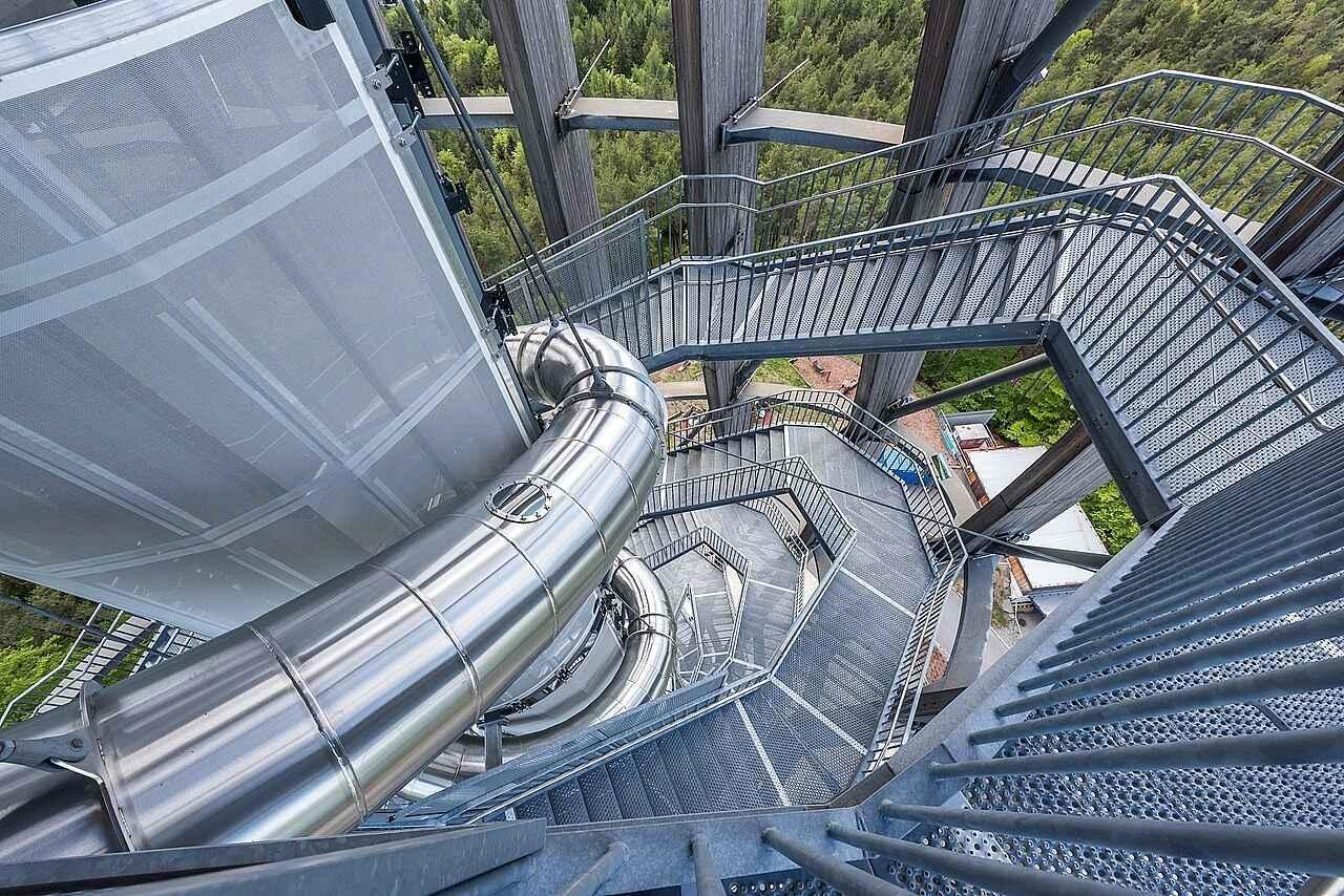 Rozhledna svým návštěvníkům, kromě nádherných výhledů, servíruje i skvělou a adrenalinovou zábavu v podobě skluzavky. Tato nejrychlejší cesta dolů je dlouhá 120 metrů a útrobami skluzavky na zapůjčených podložkách profrčíte do 25 sekund.