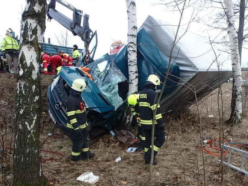 Přední část nákladního auta byla po nárazu do břízy zcela zdeformovaná. Hasičům pomohl v prvních minutách svědek nehody, který s využitím svého jeřábu částečně odtáhl vozidlo od stromu.