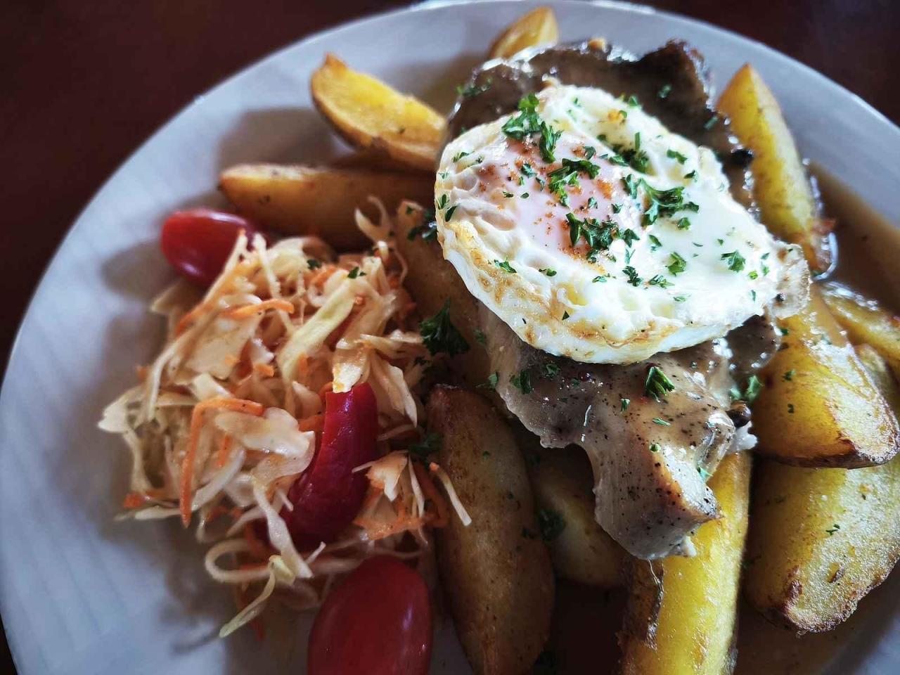 My si objednali vepřový steak na barevném pepři s volským okem a americkými bramborami za 199 korun. A pochutnali jsme si. „Jak jsem říkala, tak hlavně v týdnu tu jedeme hlavně na kvalitu, ne kvantitu. Na obědy máme pět šest jídel, o víkendu přidáváme víc. To úplně stačí,“ doplnila provozní Jana.