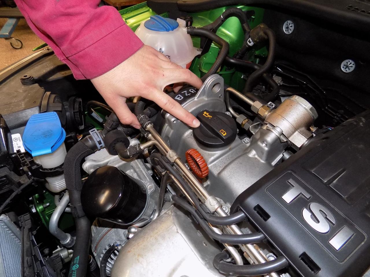 Pokud je tedy hladina oleje na měrce pod spodní ryskou, bude třeba olej doplnit. V motorovém prostoru najděte otvor pro dolévání oleje a odstraňte zátku – je většinou ve stejné barvě jako měrka oleje. Přesné umístění dolévacího otvoru oleje najdete v návodu k obsluze. Při doplňování motorového oleje používejte olej předepsaný výrobcem v jeho přesné specifikaci. Olej doplňujte postupně, vždy několik minut počkejte a znovu zkontrolujte hladinu oleje pomocí měrky.
