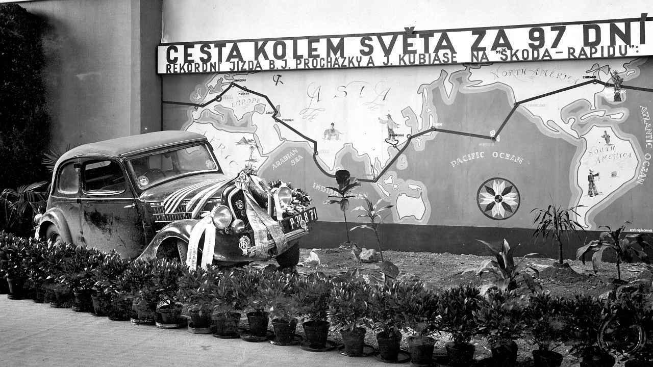 Cesta kolem světa za 97 dníSymbolickým vyvrcholením fascinující série prvorepublikových dálkových jízd vozů Škoda se stala „Cesta kolem světa za 97 dní". Podnikl ji pražský podnikatel Břetislav Jan Procházka s navigátorem a zároveň mechanikem Jindřichem Kubiasem. Jejich jen mírně upravený otevřený vůz (polokabriolet) Škoda Rapid o výkonu 31 koní (23 kW), čtyřmi nezávisle zavěšenými koly a hydraulickými brzdami obstál v bahnitých, stejně jako písčitých a kamenitých úsecích trasy vedoucí z Československa přes Německo, Polsko, Litvu, Lotyšsko, Sovětský svaz, Írán, ale i dnešní Pákistán, Indii, Malajsii, Singapur, Čínu, Japonsko či Spojené státy zpět do Prahy.