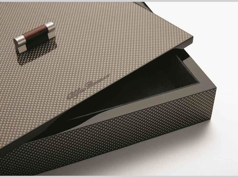 V pouzdře z nerezové oceli se skrývá ciferník se třemi separátními ručičkami a číselníky, vše oděno do karbonu a osazeno logem Quadrifoglio Verde - tedy charakteristickým čtyřlístkem. Nechybí ani číselné označení v rámci edice.