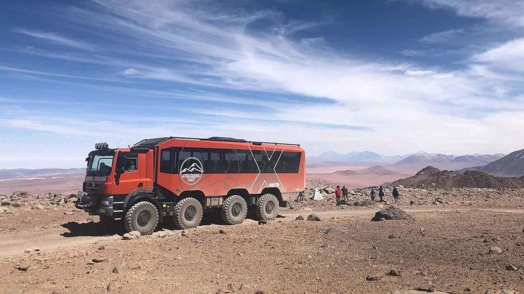 Během šestihodinové jízdy proveze speciální Tatrabus turisty pouští Atacama. Zatímco vůz žádný doping nepotřebuje, lidé mají k dispozici kyslíkové masky.