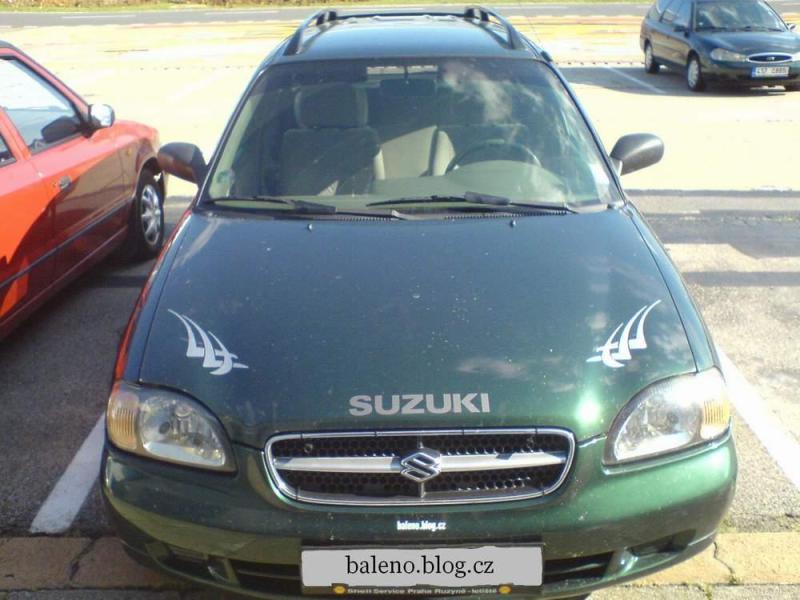 Mé SUZUKI BALENO je kombík s 16-ti ventilovou pohonnou jednotkou o objemu 1600ccm. Palivem je benzín. Barva zelená metalíza, interiér má šedou barvu. Kola jsou 14' z lehkých kovů, už dost jeté. Pětidveřová karoserie skýtá slušný prostor pro posádku, nikde se člověk necítí nijak omezen. V tomhle autě se dá i celkem slušně přespat. Nad rezervou se nachází úložný prostor pro výbavu vozu. Auto má centrál, el. okna a zrcátka, 4x repro, dělená zadní sedadla a také posilovač řízení, na střeše jsou podélné nosníky.