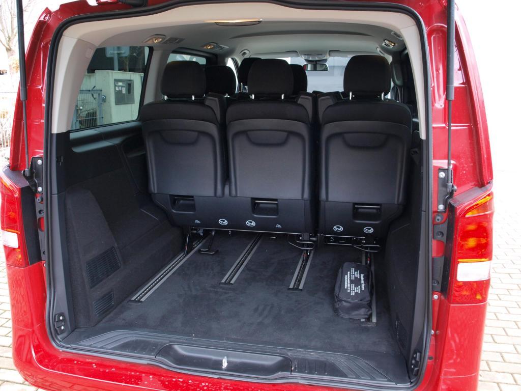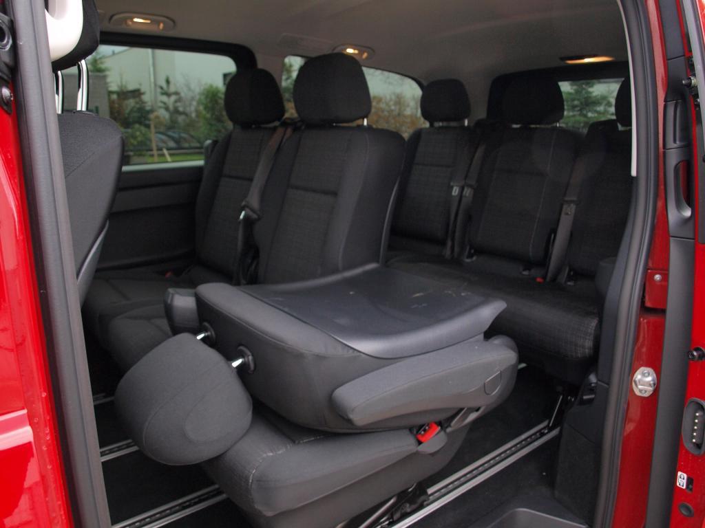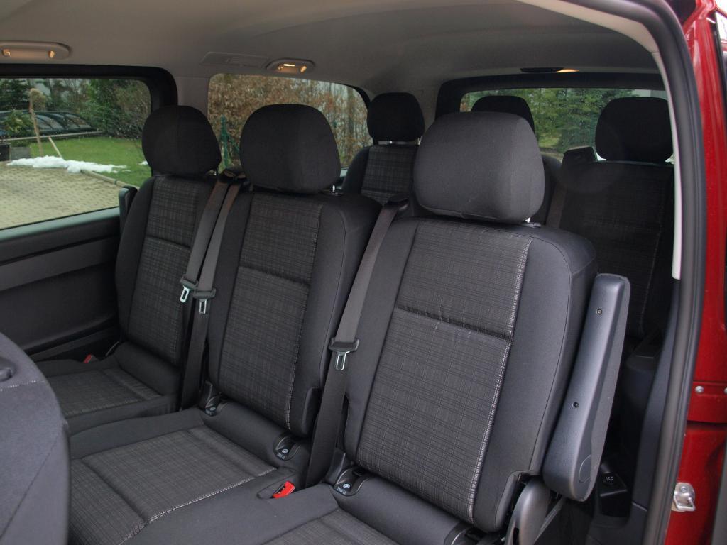 Ze tří nabízených délek Vita Tourer si Mercedes pro akční verzi Family vybral prostřední provedení L dlouhé 5140 mm nabízející nejen obří nákladový prostor 990 l, ale také spoustu místa pro cestující. Těch může jet ve Family osm v konfiguraci 2+3+3, přičemž sedadla ve druhé a třetí řadě jsou rozdělena jakou dvoulavice plus jedno sedadlo. Opěradla jsou ale samostatná. Sedadla jsou uchycena v kolejnicích umožňující podélný posuv, případně jejich vyjmutí. Jenže manipulace se sedadly není úplně jednoduchá, chce to grif i značnou sílu. Přístup ke třetím sedadlům je celkem pohodlný díky širokým bočním dveřím a možnosti odklopit opěradla krajních sedadel. Samotná sedadla jsou velká a příjemně tuhá, a to v obou řadách. Ve výbavě je klimatizace pro přední sedadla, vřele ale doporučuji dokoupit klimatizaci i pro cestující.